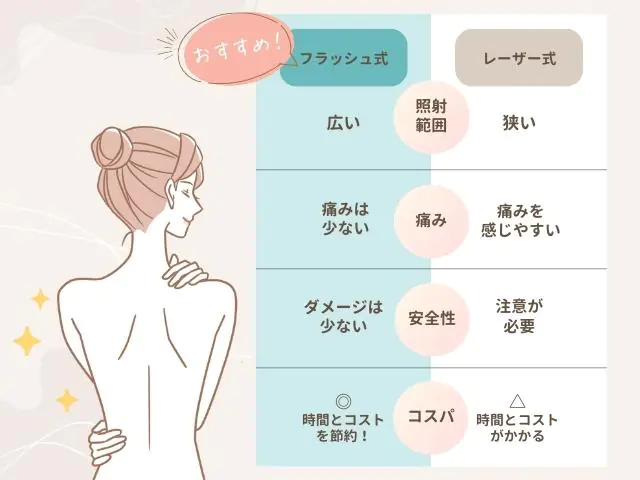 - 痛みが少なく広範囲を時短ケアしたい→フラッシュ式(IPL)
