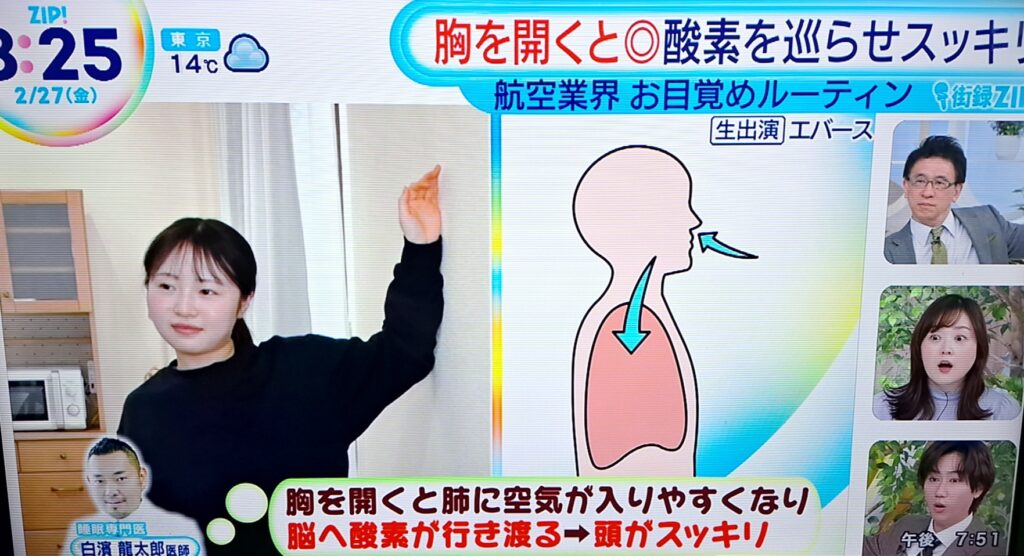 胸を開くと肺に空気が入りやすくなり 脳へ酸素が行き渡る→ 頭がスッキリ