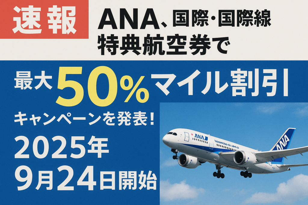 旅行好き必見!ANAが国内・国際線特典航空券のマイル割引キャンペーンを2025年9月24日から開始。憧れのあの地も、いつもの旅先も、マイルを使って通常の半分以下のマイル数で行ける夢のチャンスです。今すぐ旅の計画をスタートさせましょう!